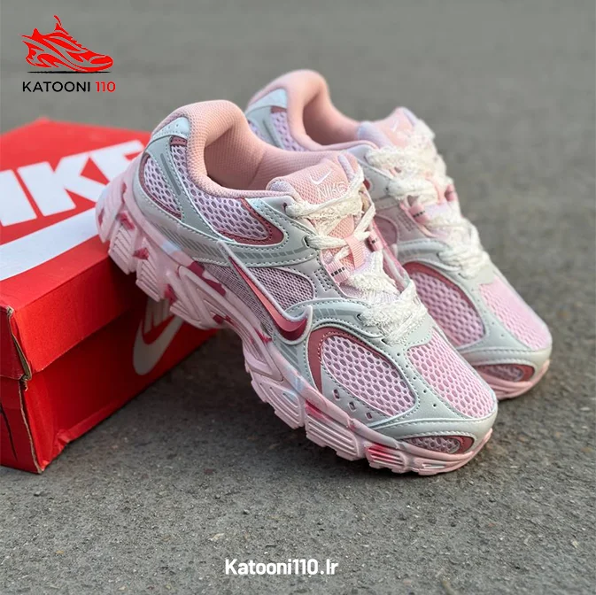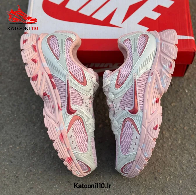 ترکیب رنگ صورتی لطیف (Light Pink) با جزئیات سفید، نقره‌ ای متالیک و قرمز در قسمت لوگوی نایک (Swoosh)، ظاهری مدرن و بسیار شیک به این کفش بخشیده است. زیره‌ی طرح‌ دار صورتی و سفید که در تصاویر مشخص است، نه‌ تنها جذابیت بصری آن را دوچندان کرده، بلکه نشان‌ دهنده‌ ی ساختار فنی و مهندسی‌ شده‌ ی آن است.